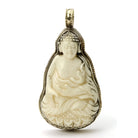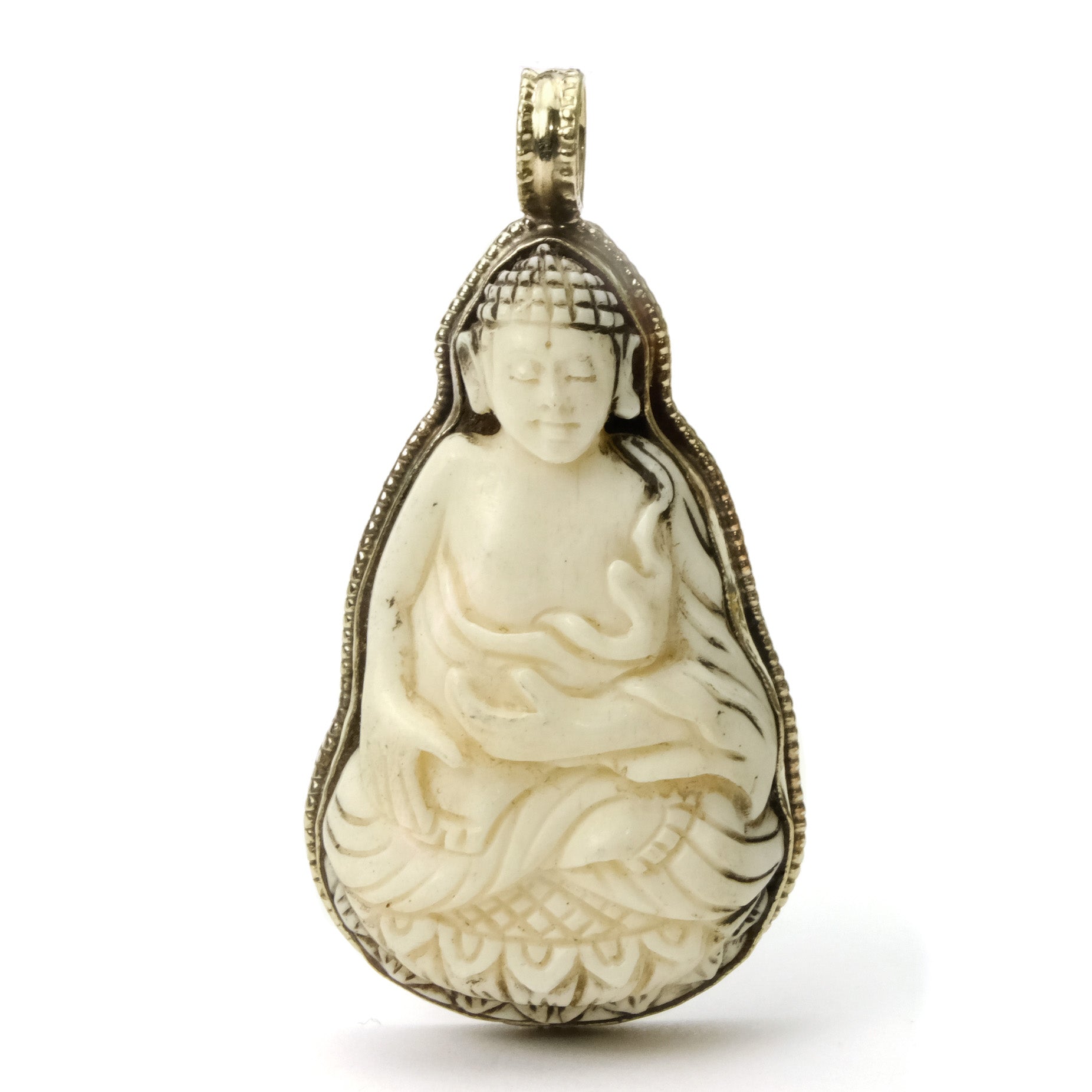 Lord Buddha Bone Pendant Defeating Evil Mudra Set in White Brass Frame