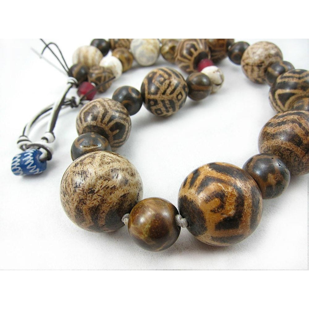 • Pumtek, or "buried thunderbolt", beads have been highly prized trade objects and amulets for thousands of years in Burma, from the ancient Pyu people to Chin tribesmen in contemporary times. The oldest are opalized palmwood, lending a specific sheen and grain; newer ones (post 1930s) may be made of different varieties of petrified wood. The Chin believe that material only occurs when lightning strikes an agatized wood deposit, and the magical symbols that decorate them are said to inherit the strength of both air and earth spirit, acting in harmony.