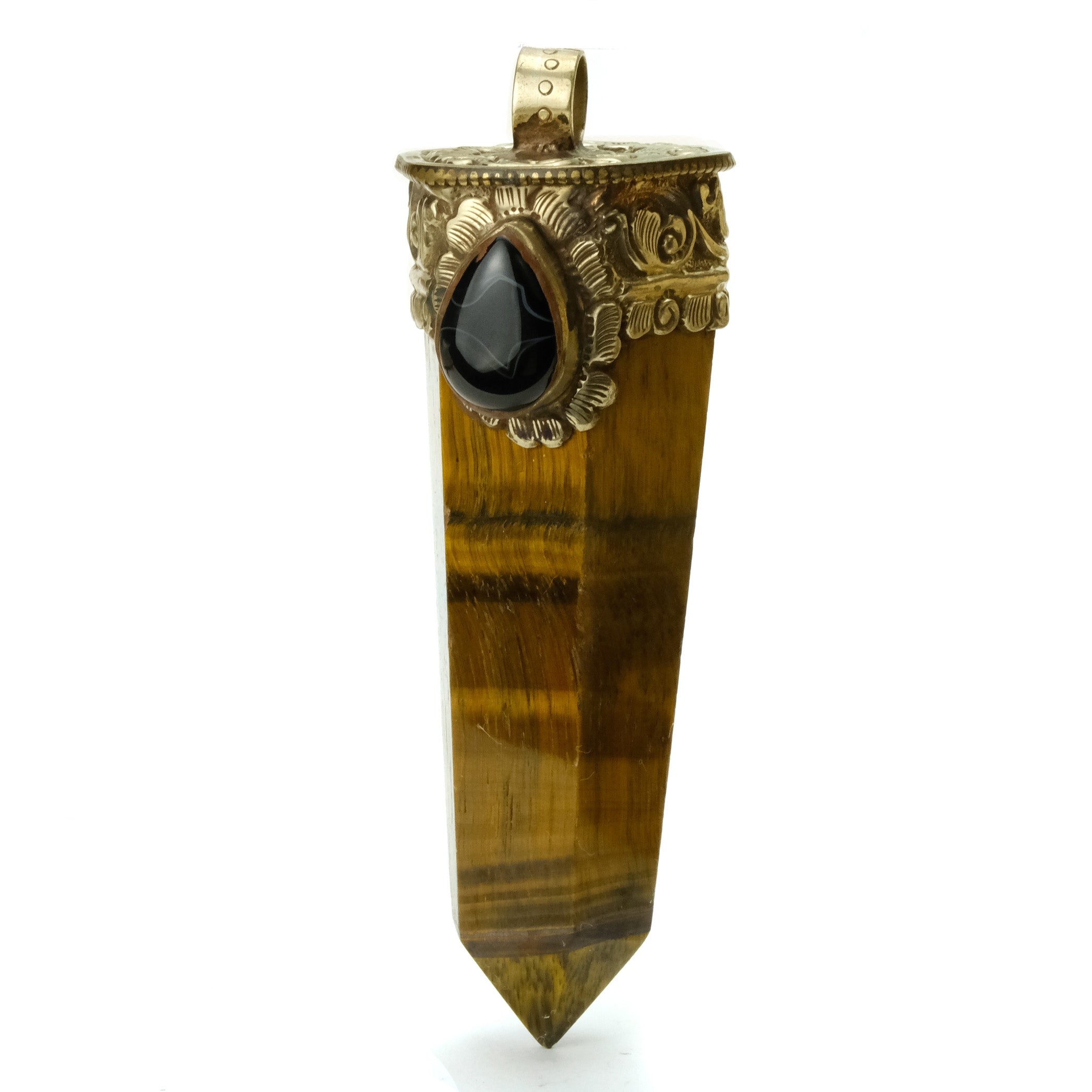Tiger Eye Obelisk Pendant Large with a Fine Polished Black Onyx Cabochon # 80