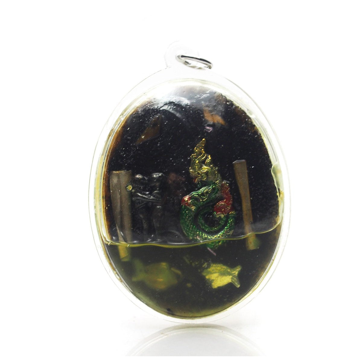 - Materials: hand carved cow bone by a Master Amulet Maker, painted and adorned with Sacred Yants and Ritualistic symbols, suspended in oil inside a custom plastic case.