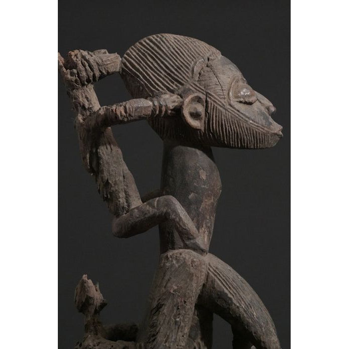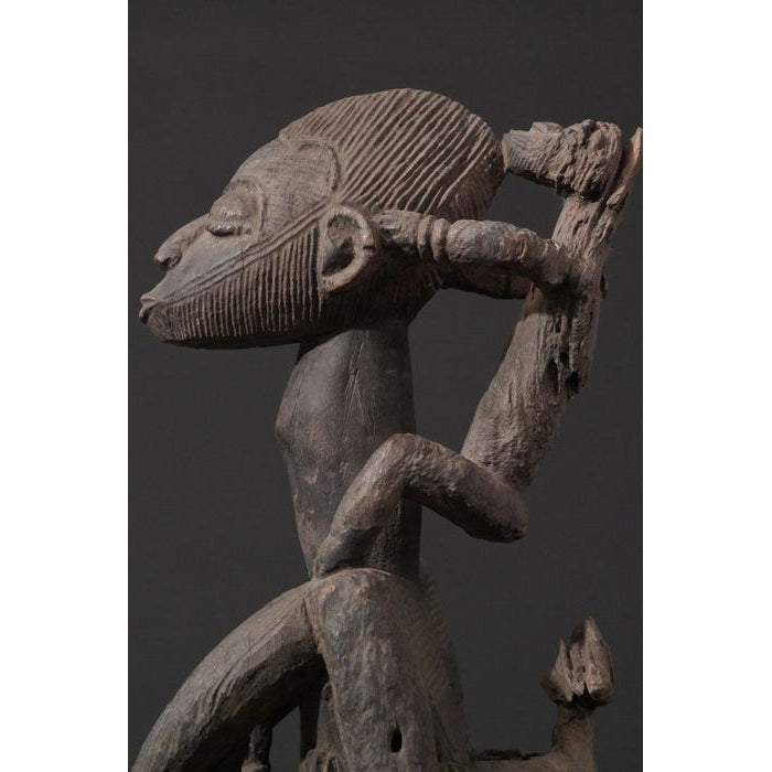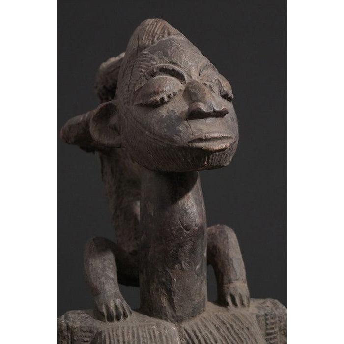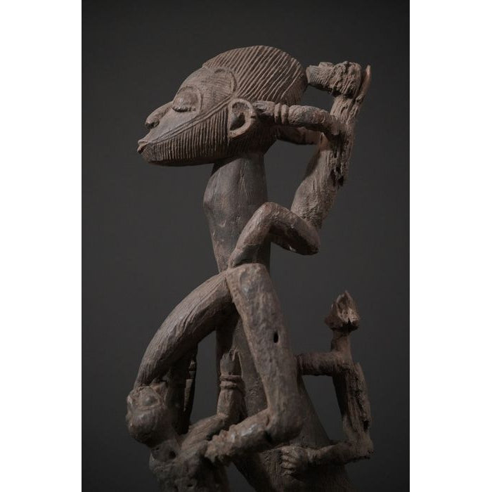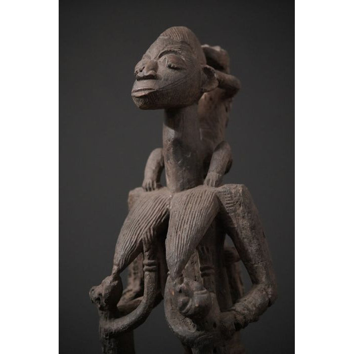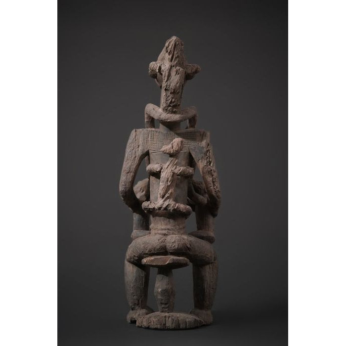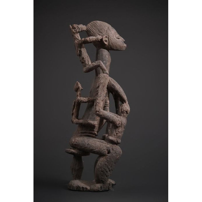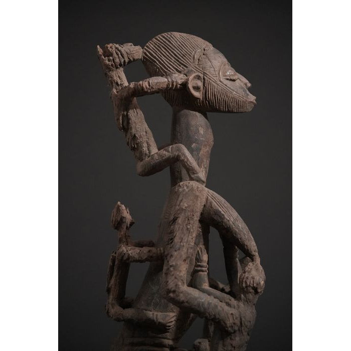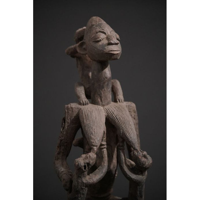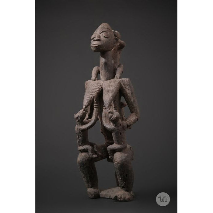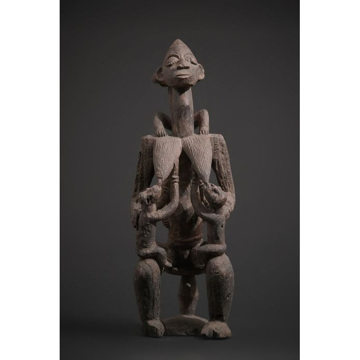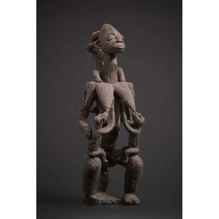 • Afo / Eloyi Maternity Figures often depict Female Figures accompanied by Children and are made for Shrines important to Villages. The Figure shows a seated Female Figure with two small Children on her back and two smaller Child Figures sucking on her breasts. The breasts are worked with similar line patterns as the hairstyle, damage due to age and weathering especially on the right arm, the feet and on the rear Child figures; dark patina with encrustations.