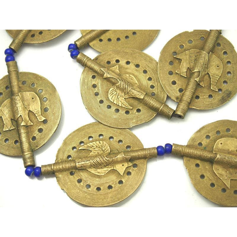 Baoule Authentic Hand Cast Brass Beads Necklace Large with Classic Sun Disc Shapes Punched Holes ELEPHANT/ ROOSTER MOTIF