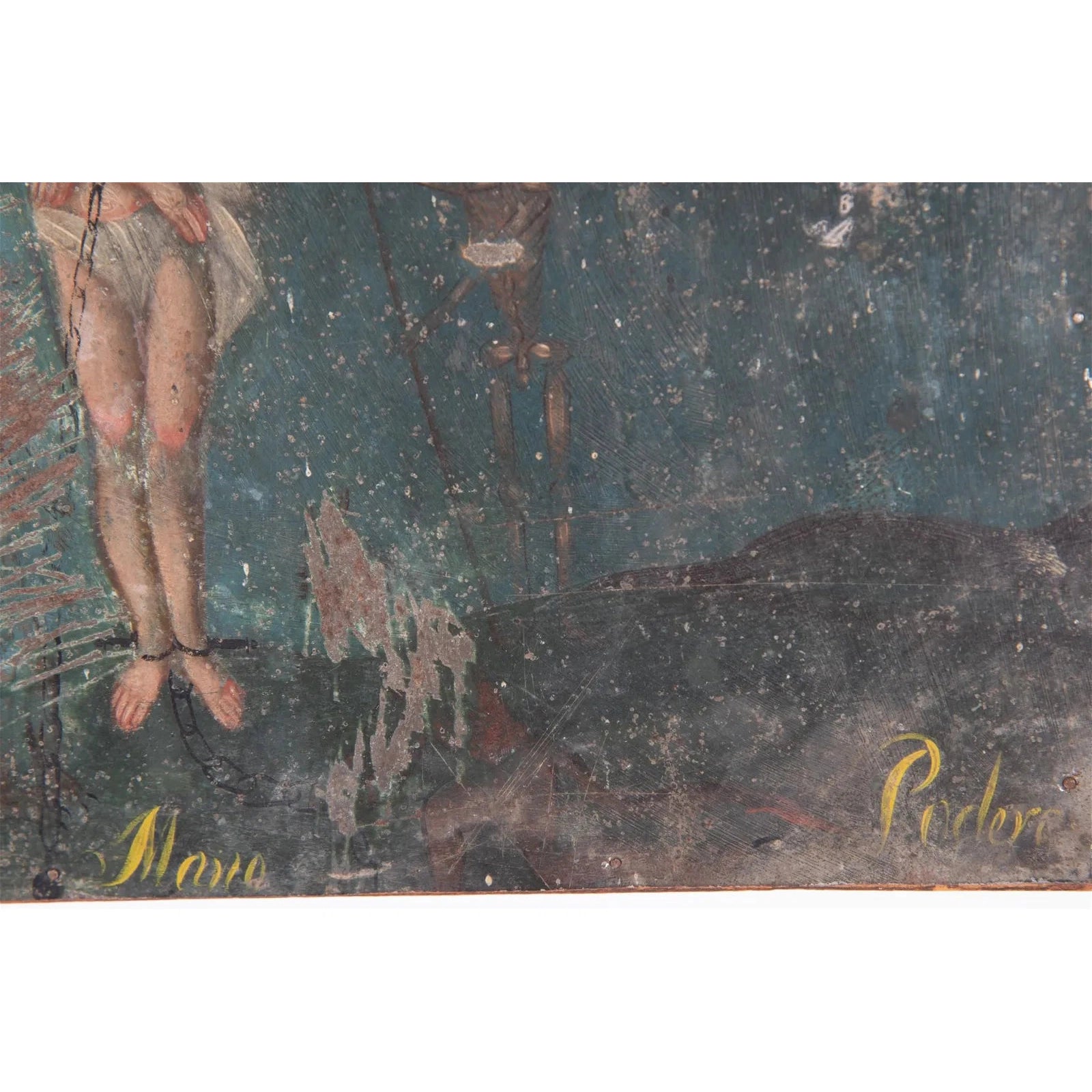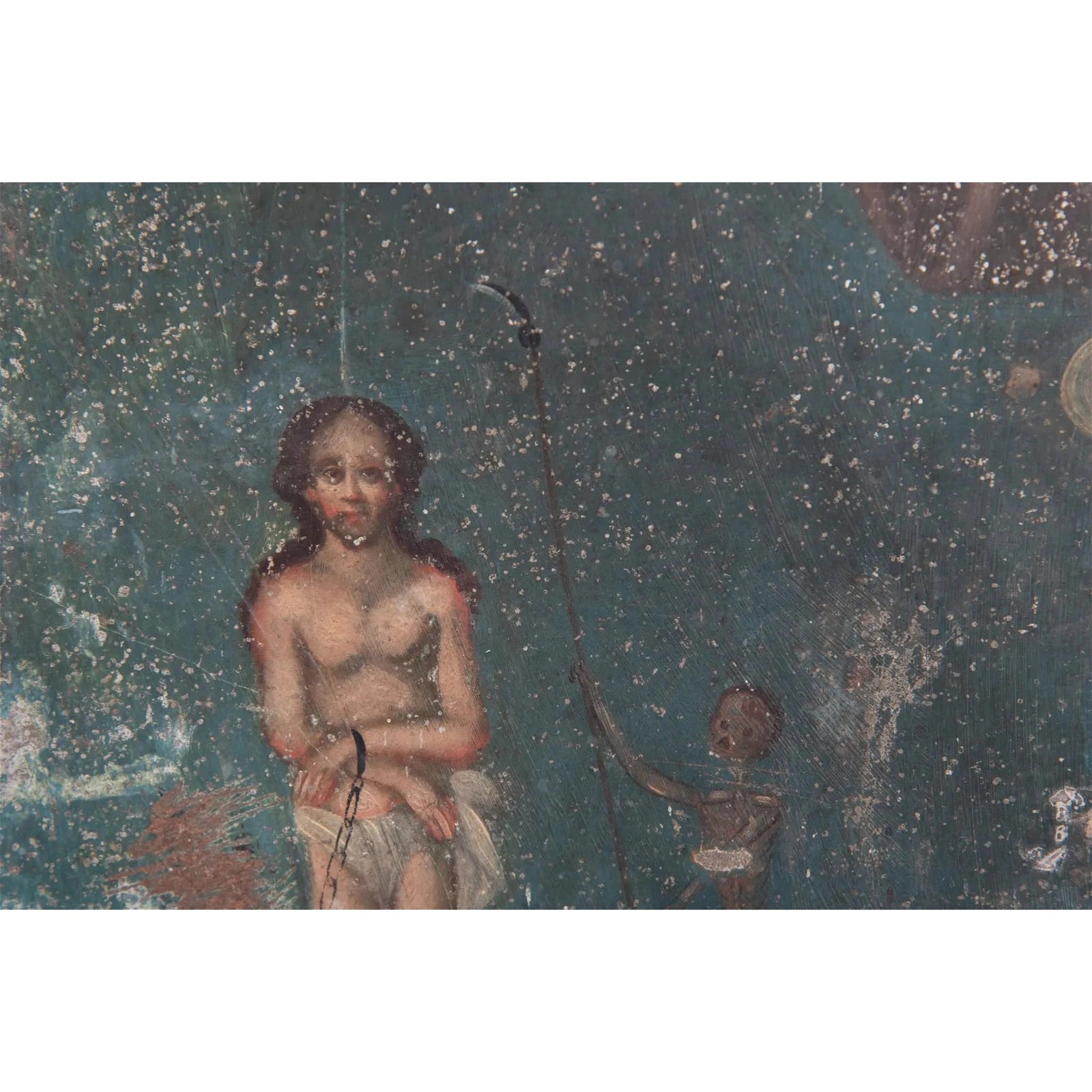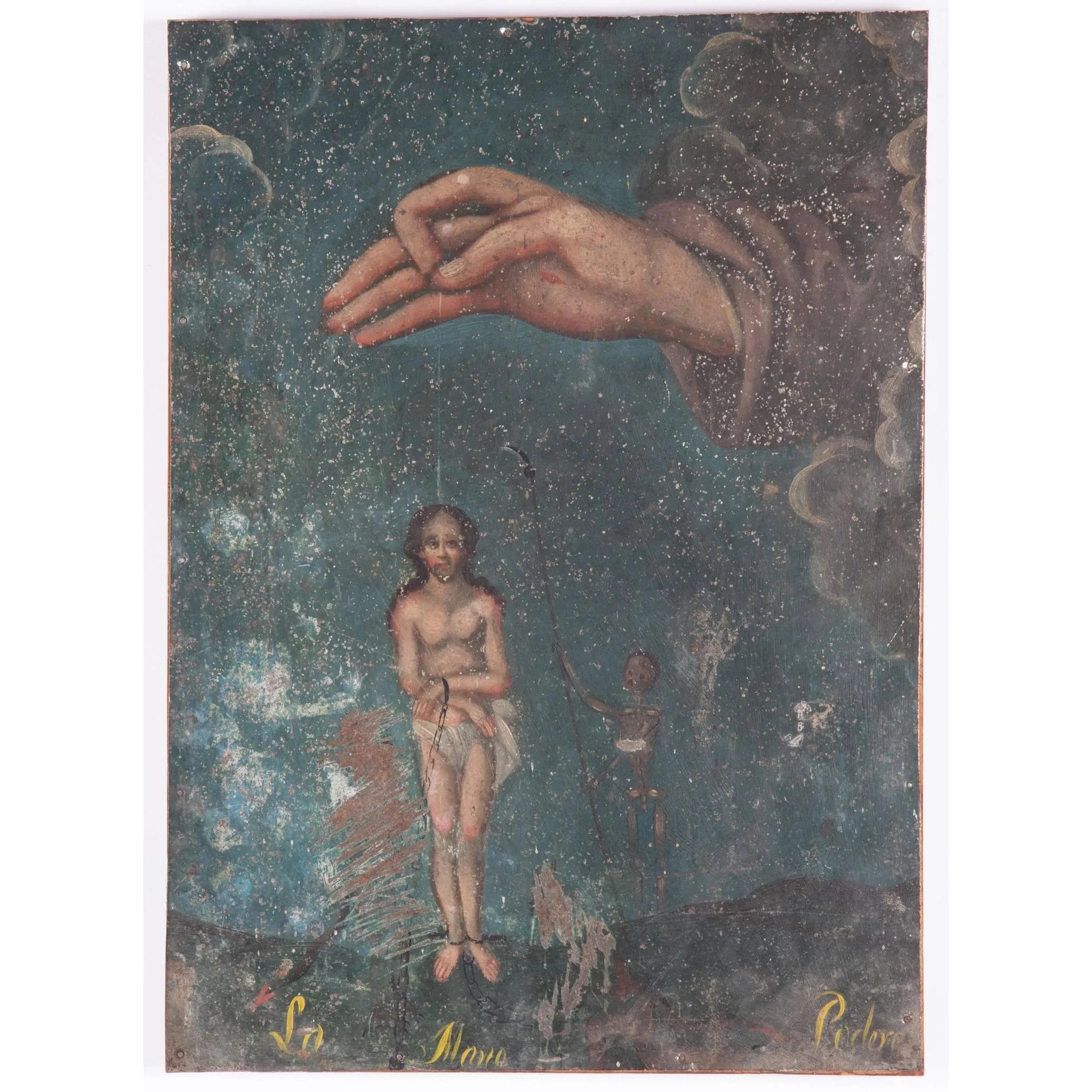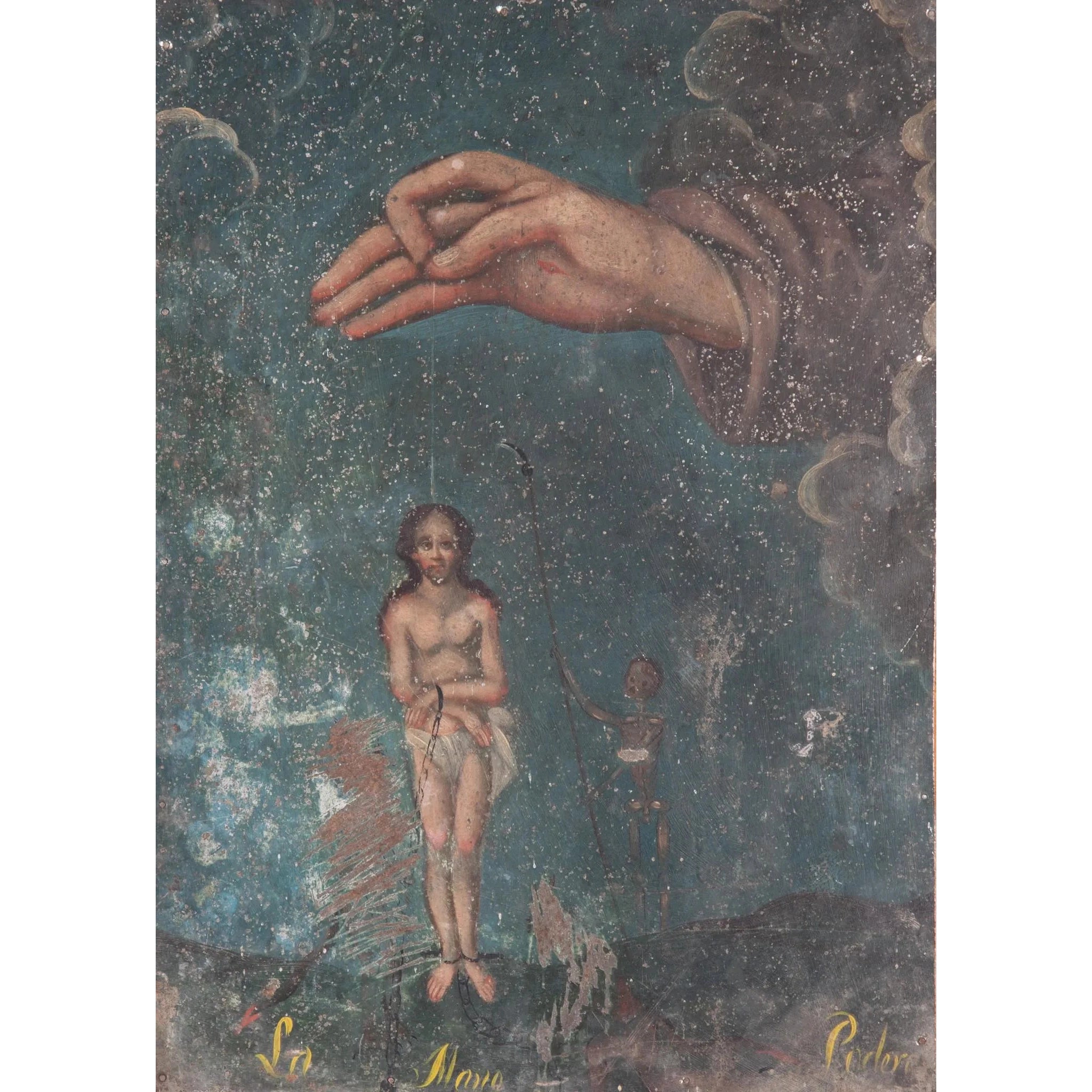 - A Very Rare 19th Century Retablo of La Mana Poderosa. A very famous subject, showcasing the hand of God seemingly controlling a Christ looking figure with a string. There are skeletons on either side.