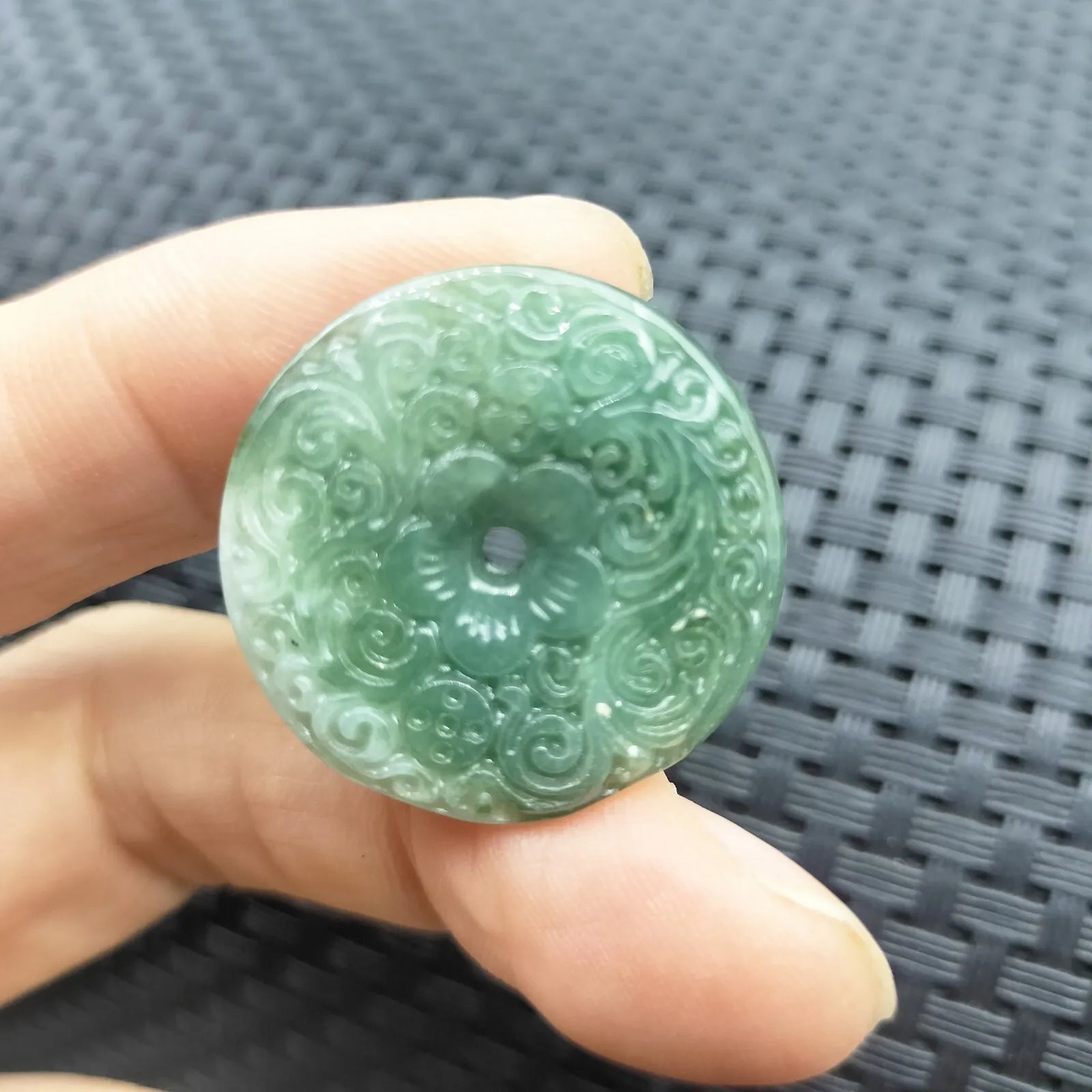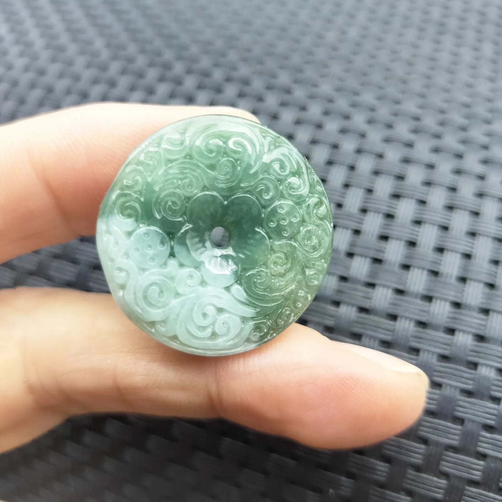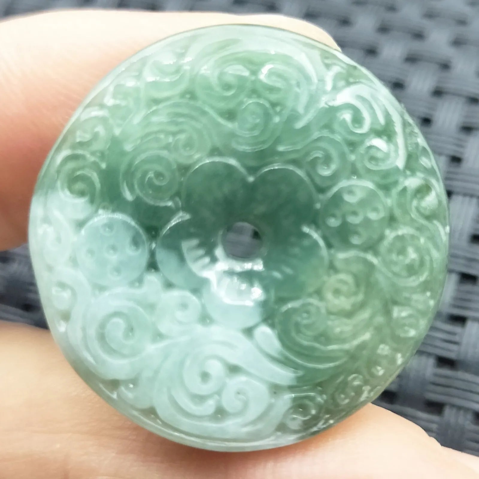 Certified Green Natural Type A Jadeite Carved Moire Safety Circle Donut Pendant Necklace