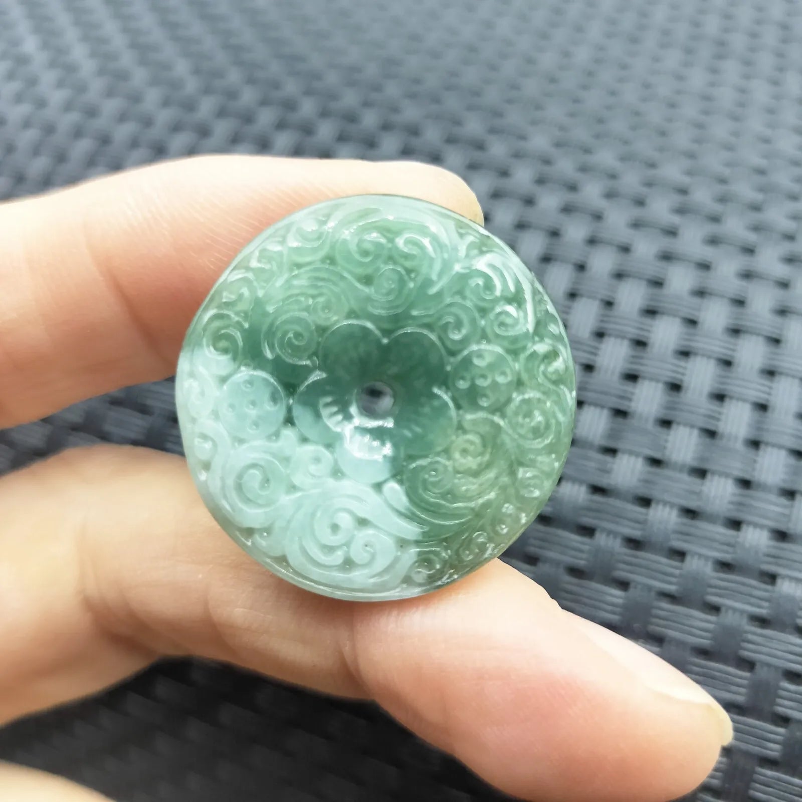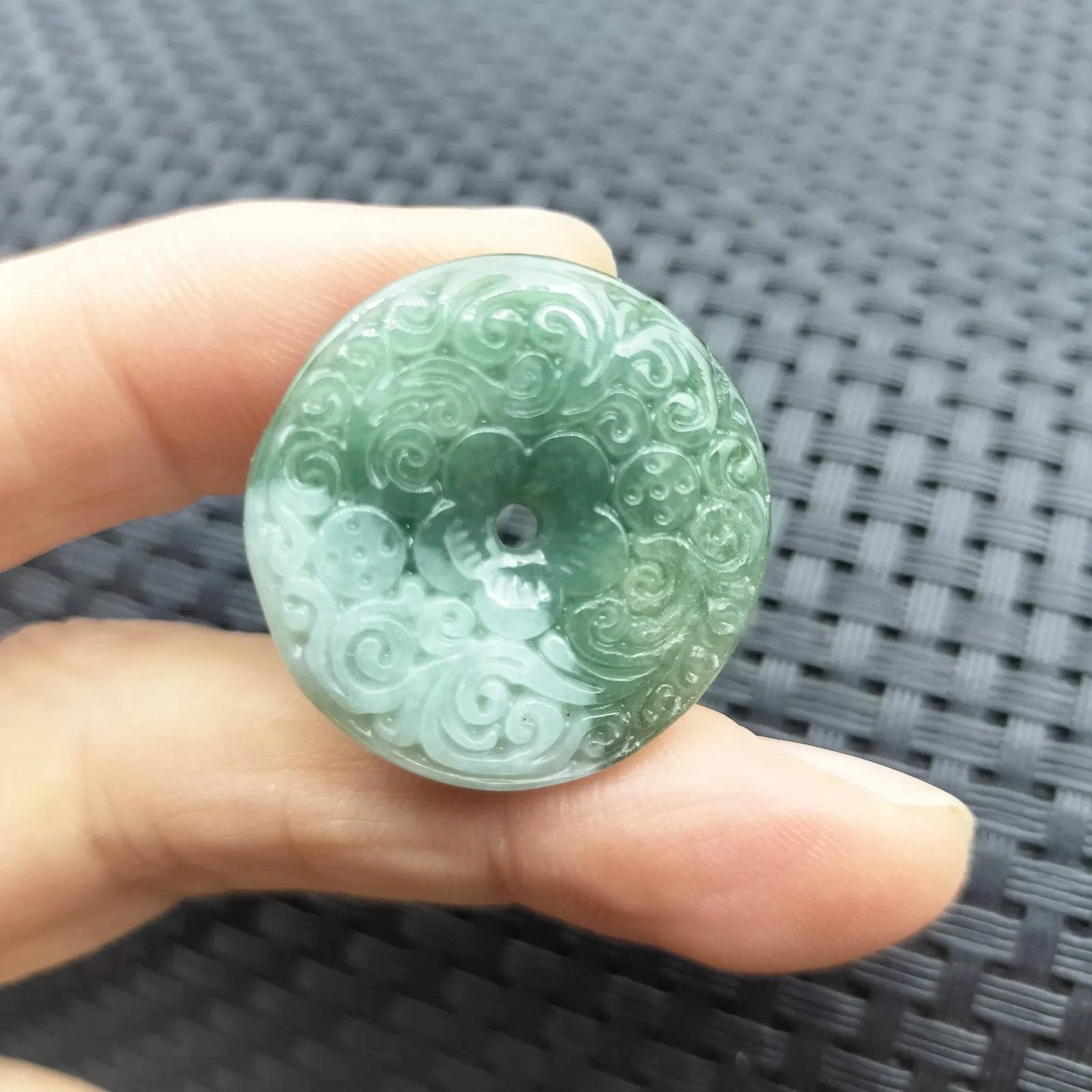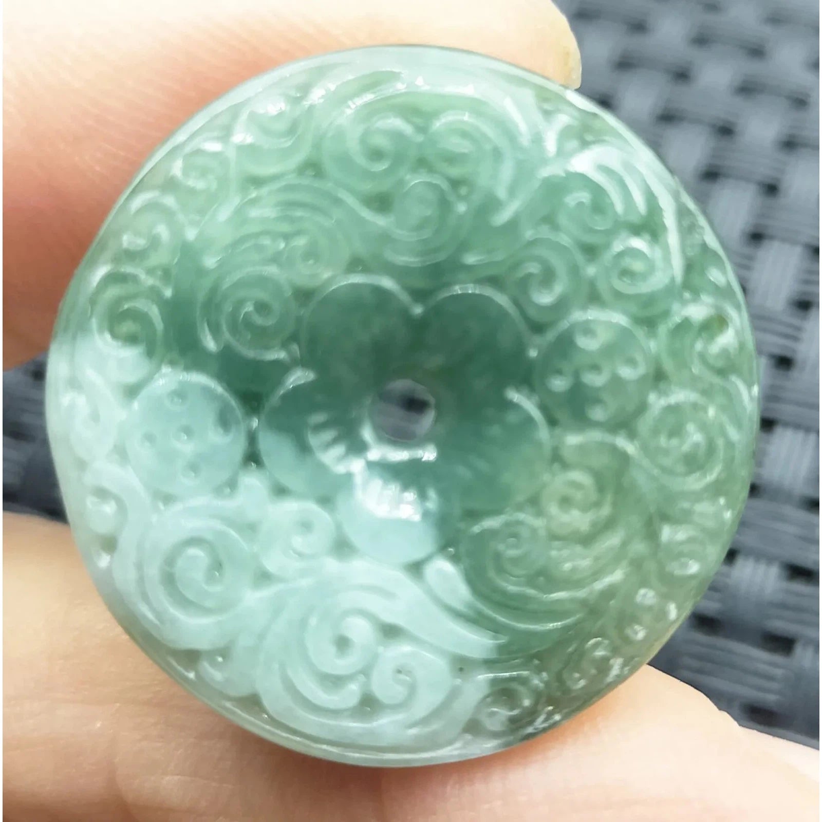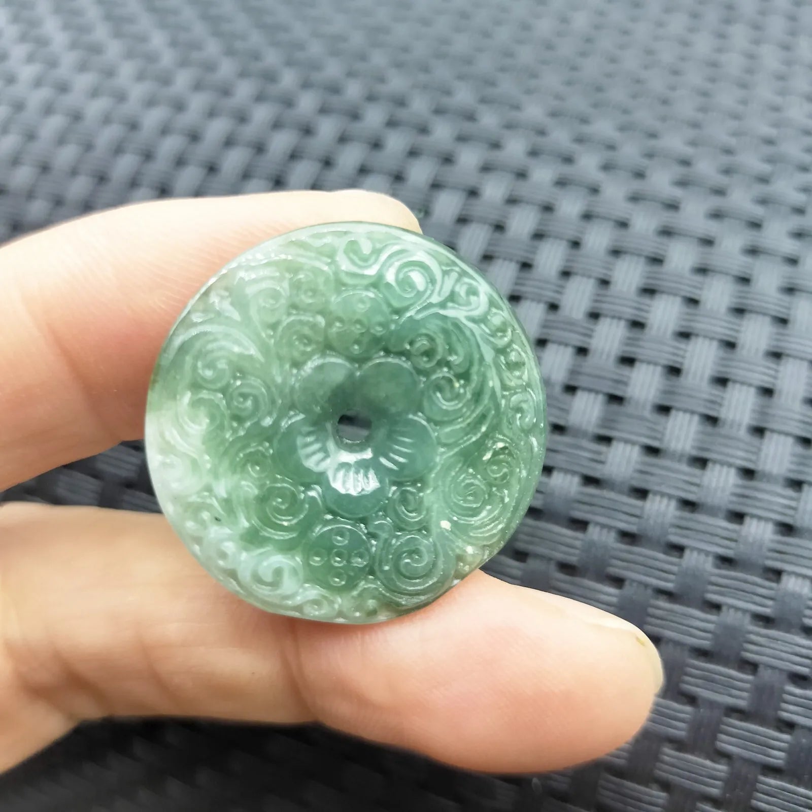 Certified Green Natural Type A Jadeite Carved Moire Safety Circle Donut Pendant Necklace