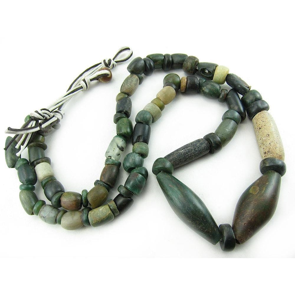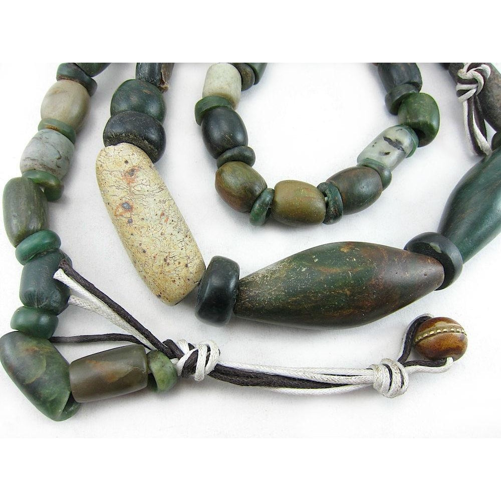 • Vivid Forest Green Serpentine have been treasured throughout West Africa for more than a thousand years. These ancient hand shaped and drilled stone beads were found in Mauritania and Mali, where they are though to have been imported into Africa across important trade routes for Gold, Copper, and Salt at the height of the Empire of Mali.