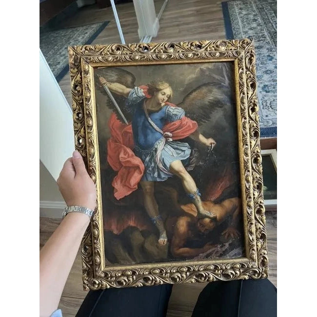 19th Century Retablo of Angel Michael Defeating Lucifer on Copper Plate