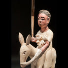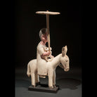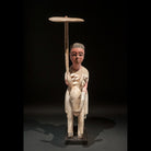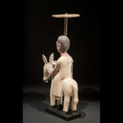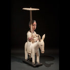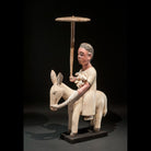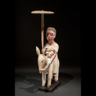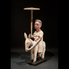 • The sculpture is sensitive and smooth, a pleasant and peaceful presence emanates from it. The Rider seems absorbed, their gaze far away. They hold a large umbrella in one hand. A necklace of cowries adorns the neck. The mouth bears traces of Offerings. There are also remnants of kaolin powder.