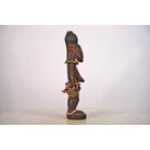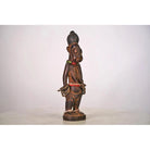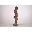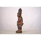 • A standing female Ibeji figure adorned with beaded necklaces and metal rings.