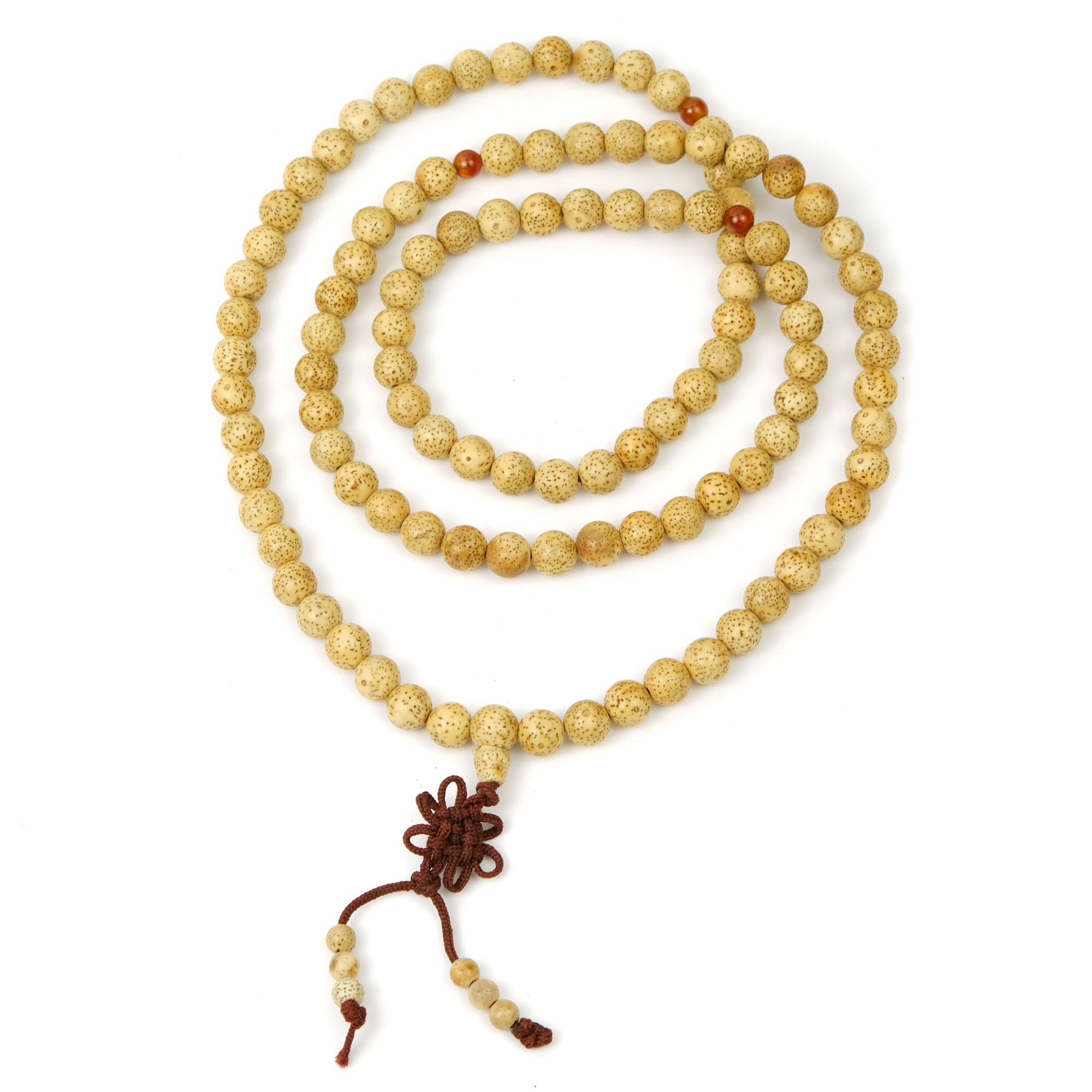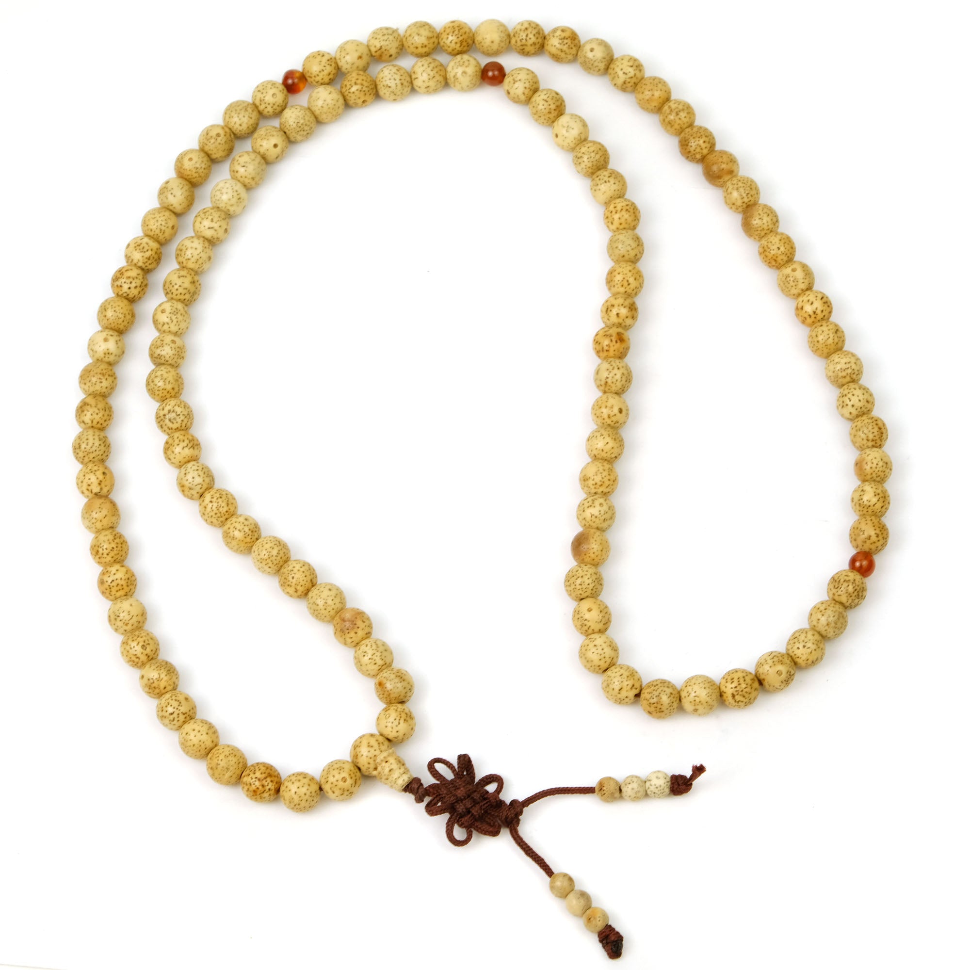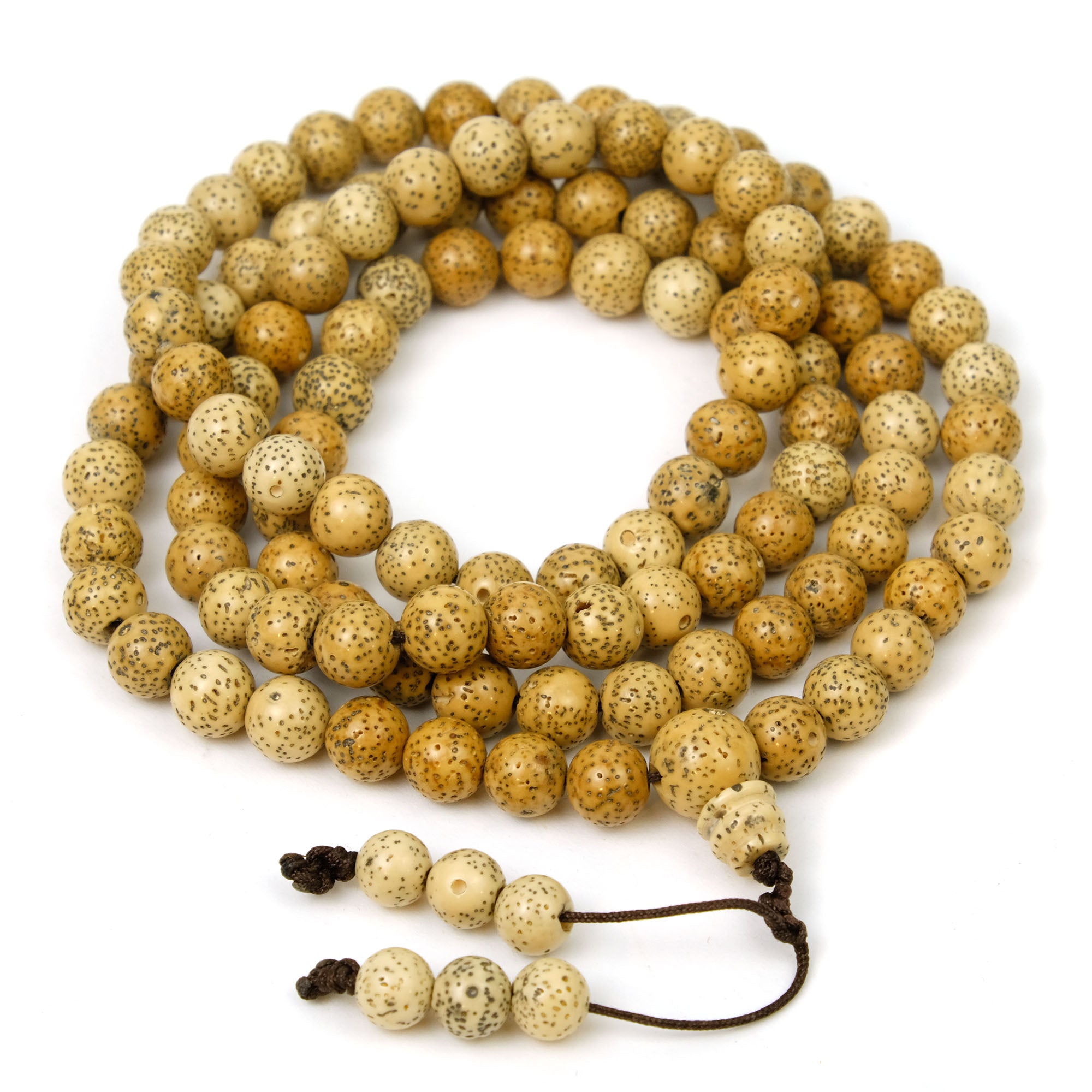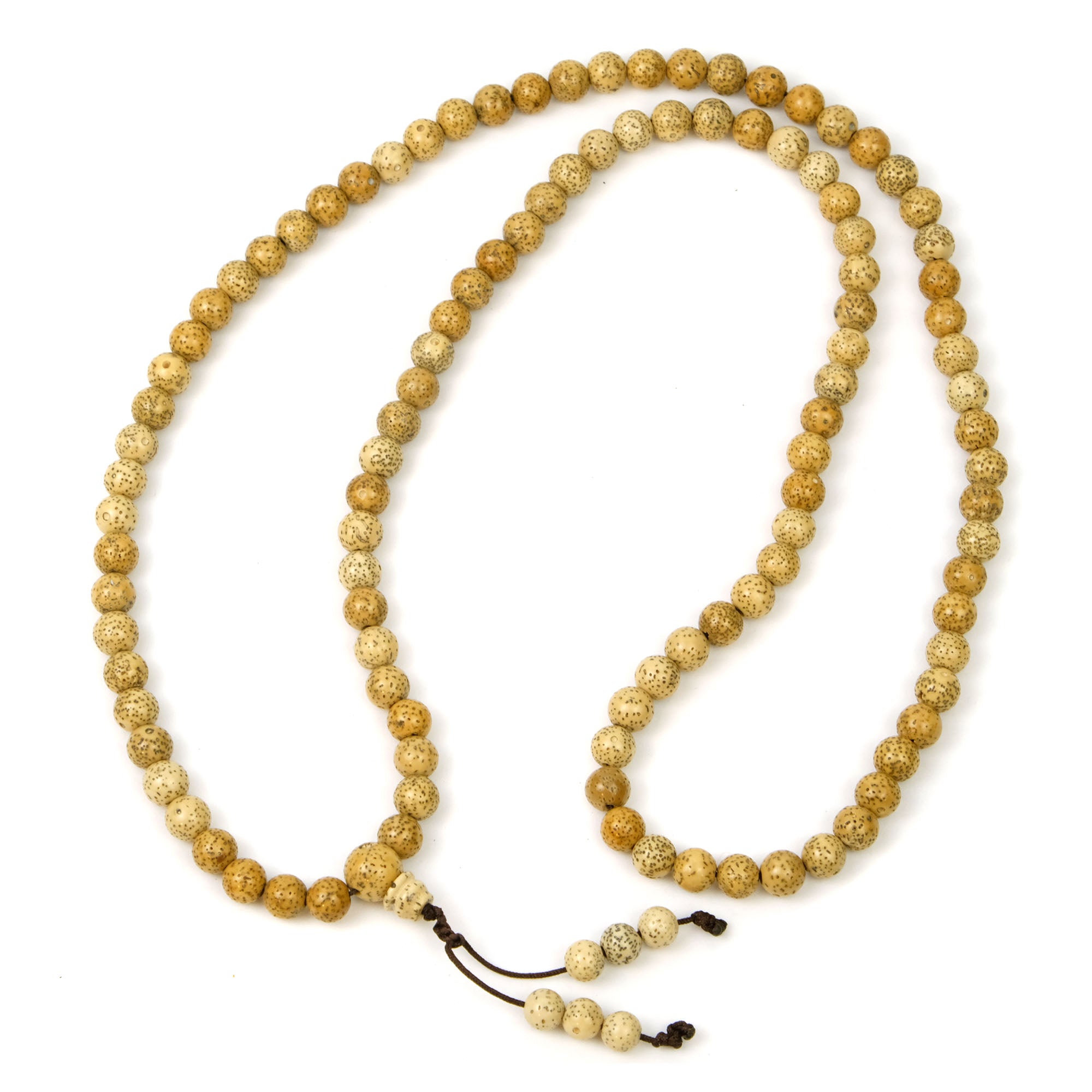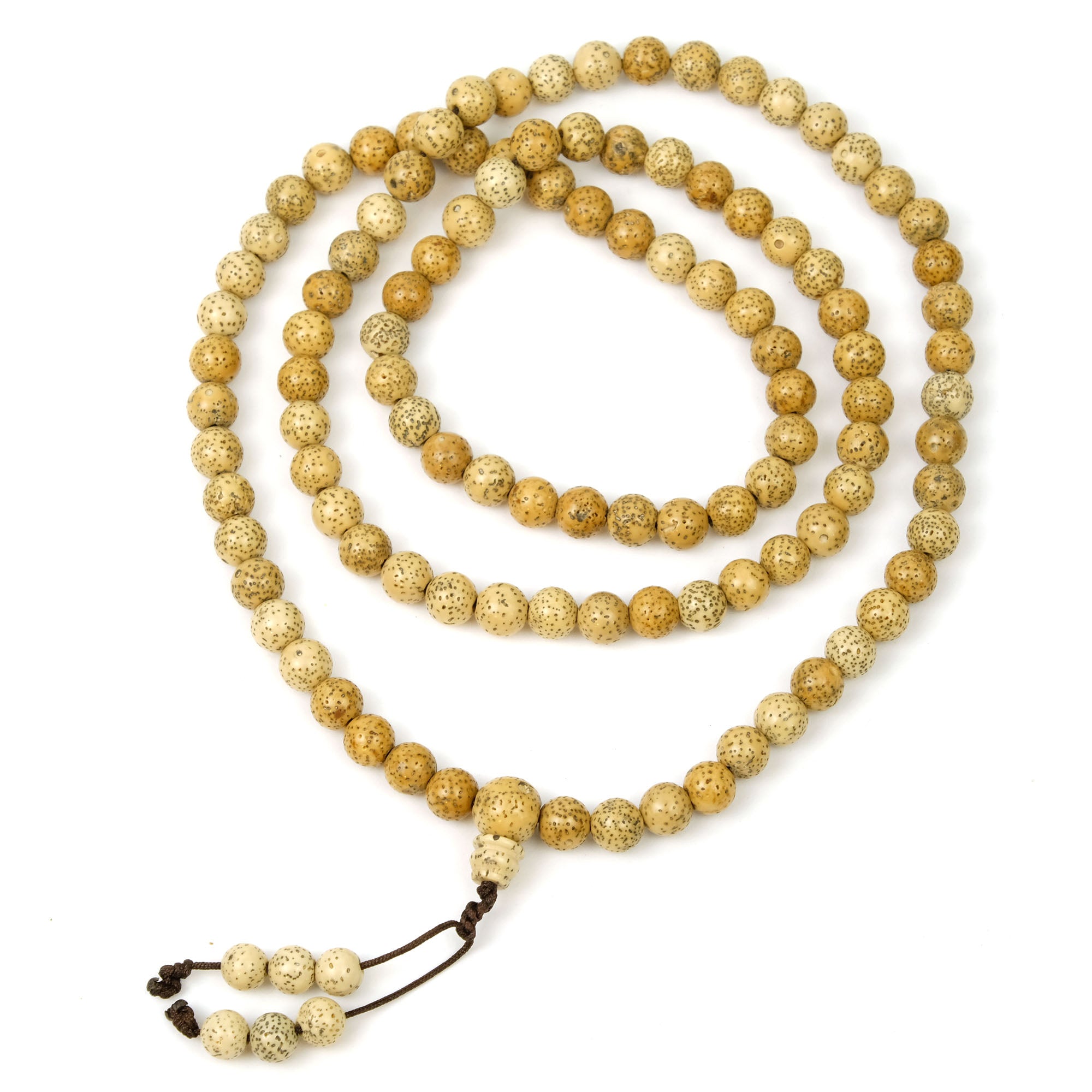 Rattan seeds are sometimes called 'Moon and Stars' by Tibetans, and variously called 'lotus root', 'lotus seed' and 'linden nut' in many areas. The bead itself is hard and dense, ivory coloured (which gradually turns a deep golden brown with long use), and has small holes (moons) and tiny black dots (stars) covering its surface.