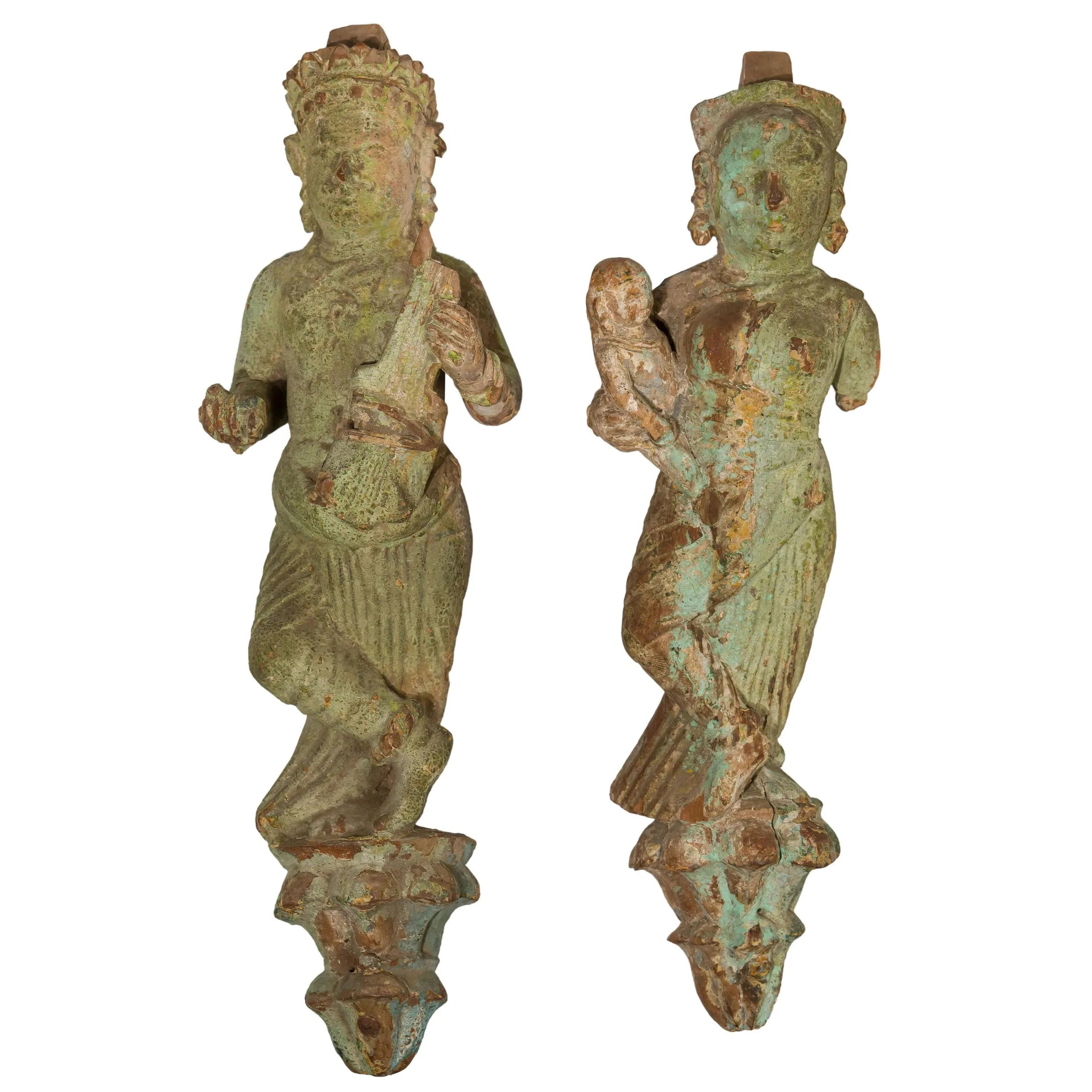 19th Century Indian Musician and Wife and Child Carved Wood Figurines Pair