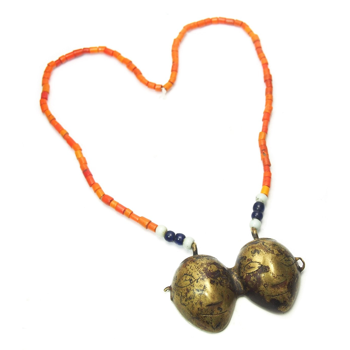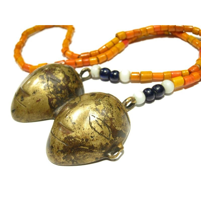 • Hand-wound Naga "Coral Glass" Heirloom Beads were originally hand wound glass trade beads created in the late 19th century up until the mid 20th century in China, and made to resemble precious red coral. These richly colored beads were later traded among Naga people in Northern India and Burma. Because of their rarity and desirability, these "foreign" glass beads became treasured heirlooms among the Naga people. The beads were often strung with other high value indigenous Naga heirlooms, like this twin brass pendant representing "Taken Heads of Vanquished