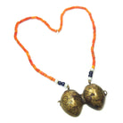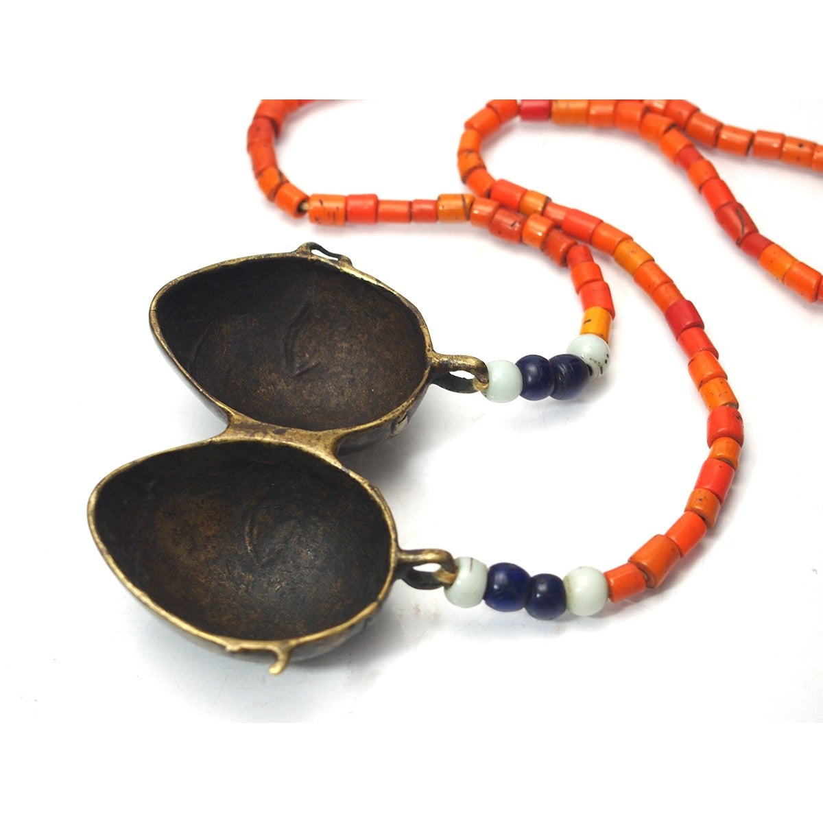 • Chinese hand-wound glass beads made to resemble coral and amber, strung on a cotton cord with a twin brass prestige "Taken Heads" pendants. Used by Naga people as Heirloom and High Prestige Jewelry.