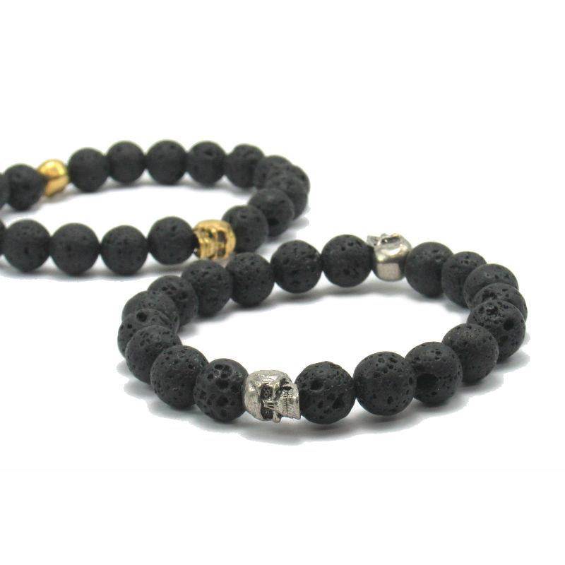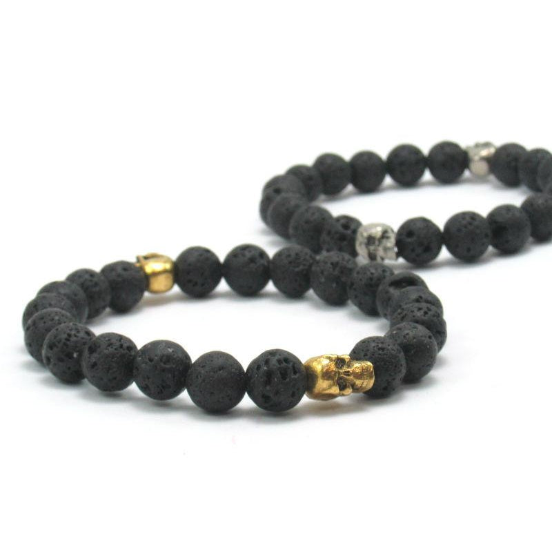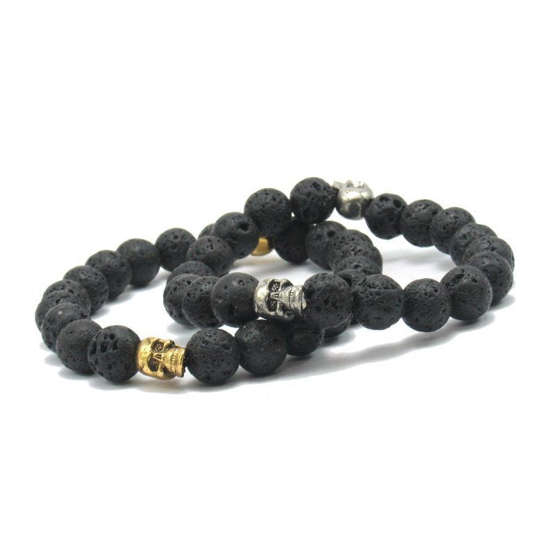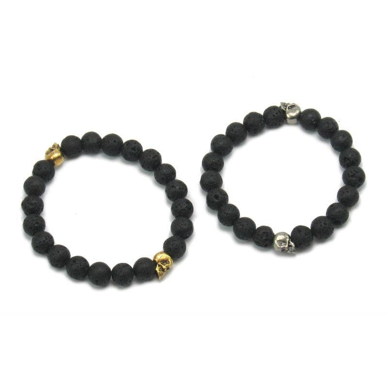 Lava Stone Stretch Bracelet with Metal Skull Beads