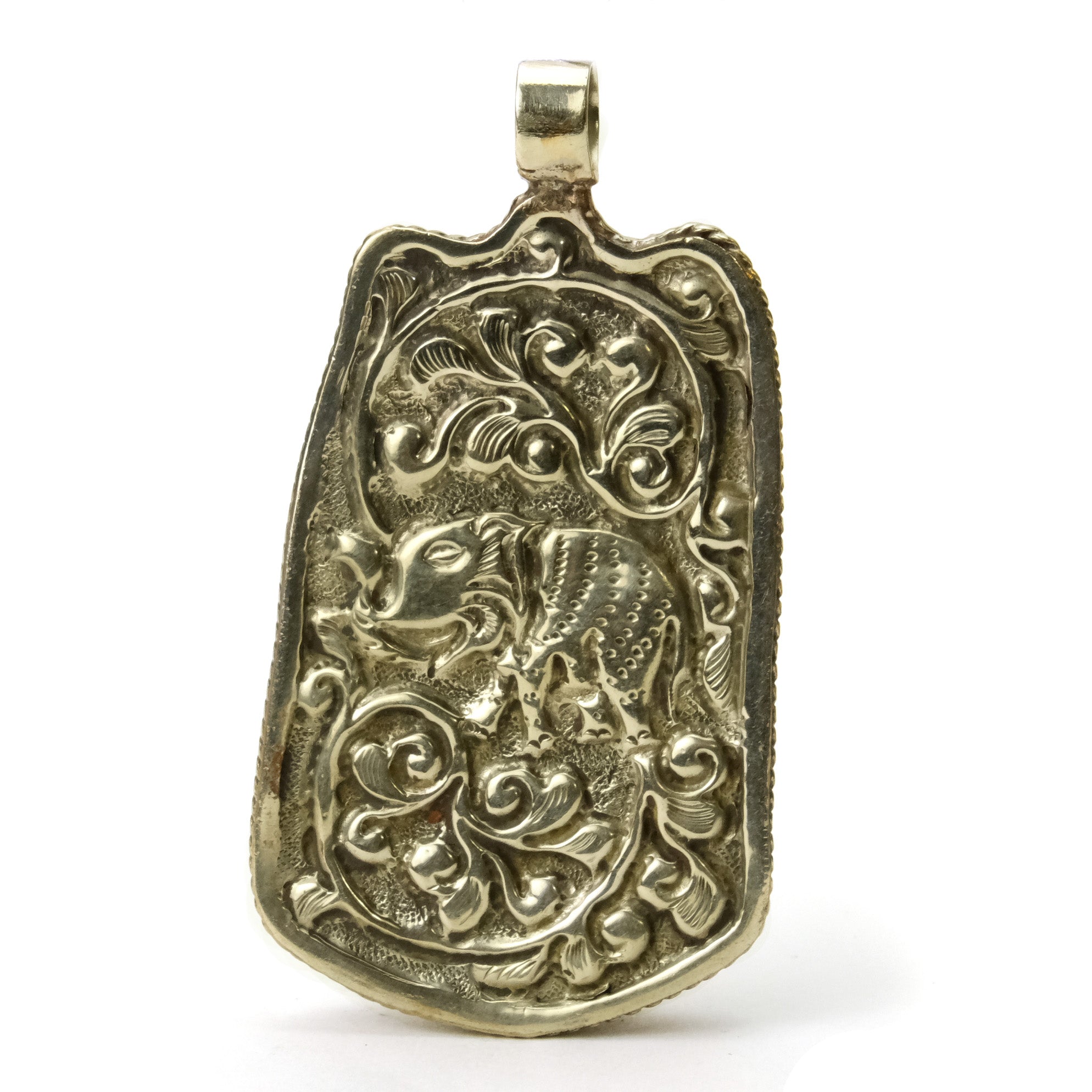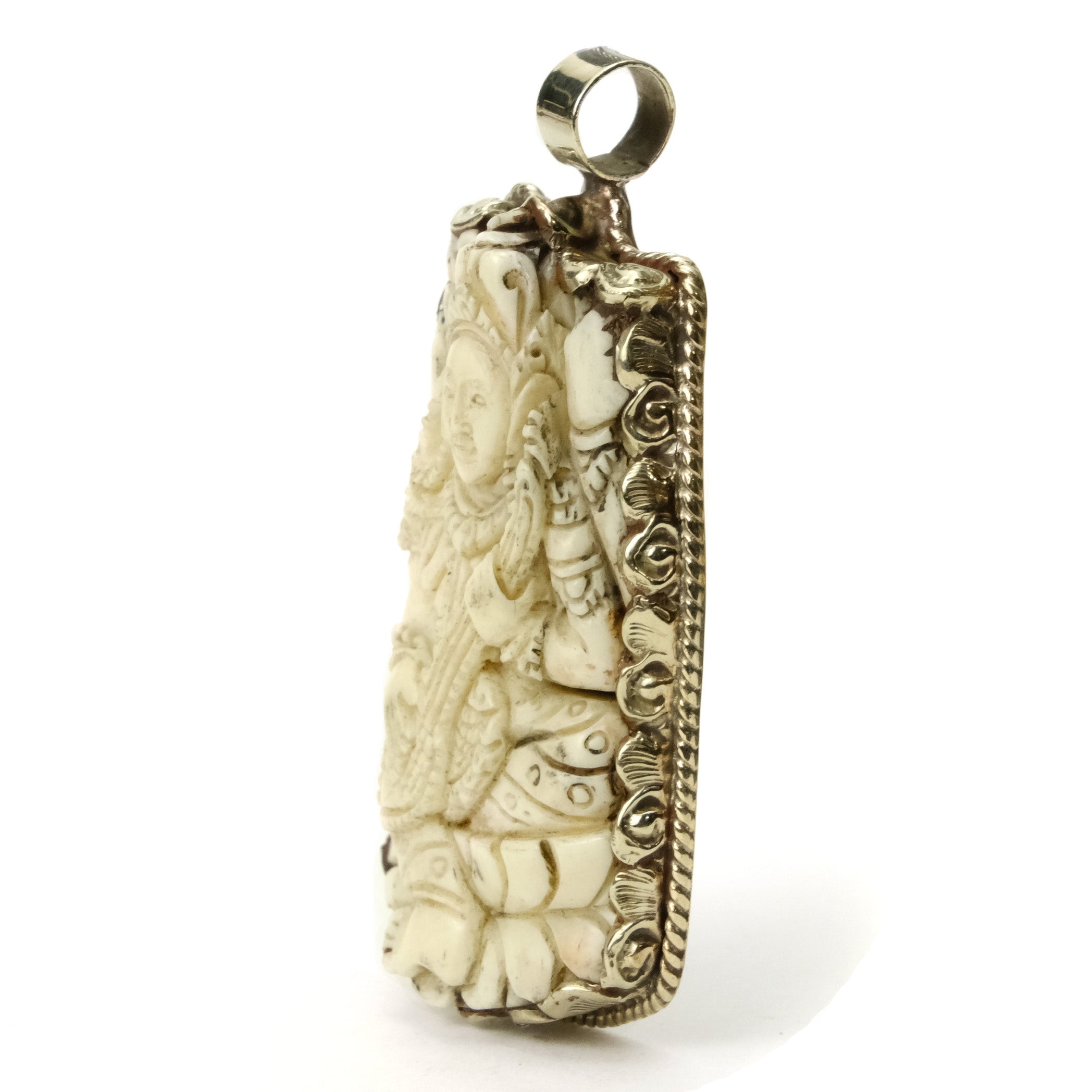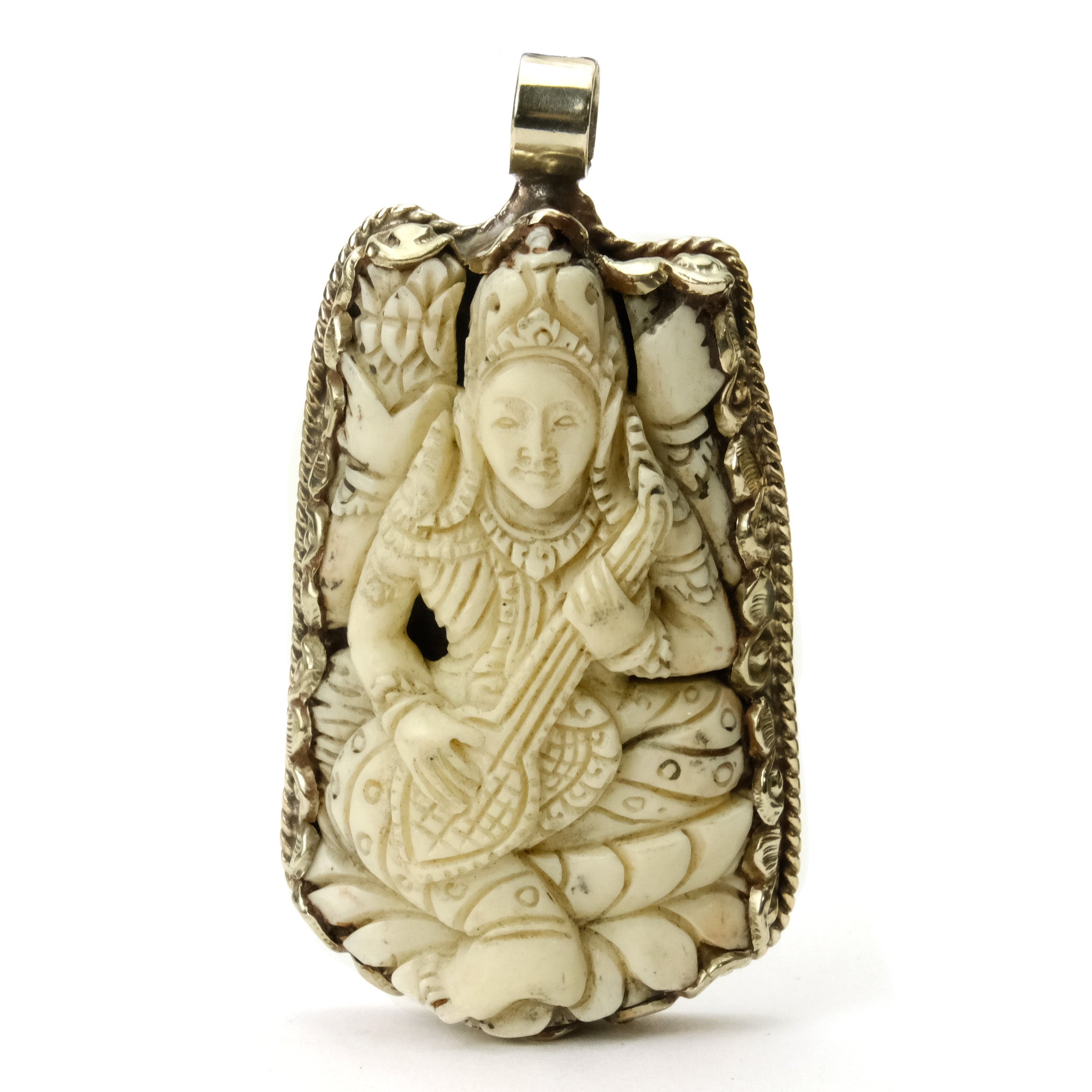 Saraswati Hindu Goddess of Knowledge, Music, Art, Wisdom and Learning Bone Pendant Set in White Brass Frame