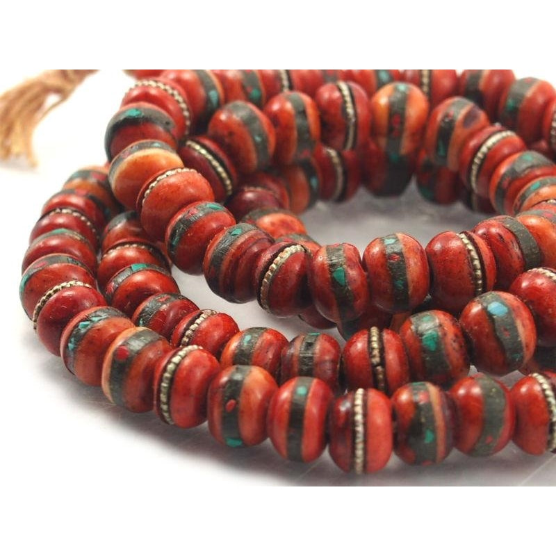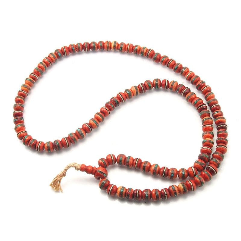 Tibetan Inlaid Cow Bone Mala Red 10mm