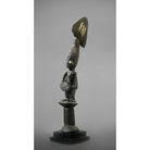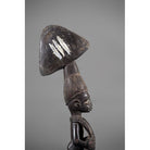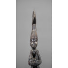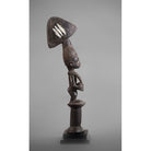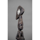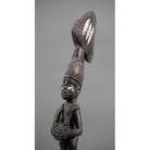 This fine dance wand, or oshe, has superb patina and obvious age. Its contours have been rounded by handling, and the wood has developed a rich hue. It is carved as a supplicant female devotee of Shango, the Yoruba thunder deity. The depiction of a woman kneeling, lifting her breasts and having a baby strapped on her back is well known in Yoruba carving. It is a symbol of fertility and a gesture of greeting, offering and acceptance. Perhaps seen as naked and submissive to the Western eye, the form of the female is seen as gracious, generous and modest among the traditional Yoruba. The devotee is carved with an over-sized thunderbolt, edun ara, on her head. This aspect symbolises one’s destiny and burden. (The thunderbolt is a symbol of Shango.) Balancing the thunderbolt on one’s head is a metaphor for balancing the great power of Shango – the power that creates empires, but which also requires great care not to exceed its limits, which would bring about destruction.