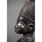 The figure has bulging, semi-circular eyes; a flat nose with flared nostrils; and pursed lips, which is all suggestive of an Egbado provenance. The figure’s ears resemble angel’s wings. Her breasts are full and held forward. Three vertical scarifications (pélé) are incised on her forehead. Three horizontal scarifications (àbàjà) are incised on each cheek. The àbàjàs are more prominent than the pélés on the forehead. Overall, the female figure is almost symmetrical, except for the carving of the baby on her back.